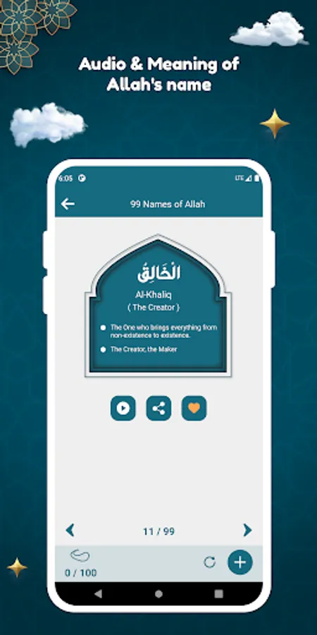 • Provides the list as well as detail with the meaning of Allah and audio to play.