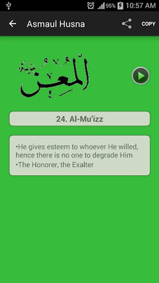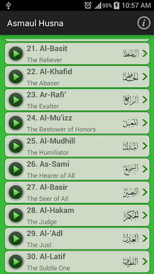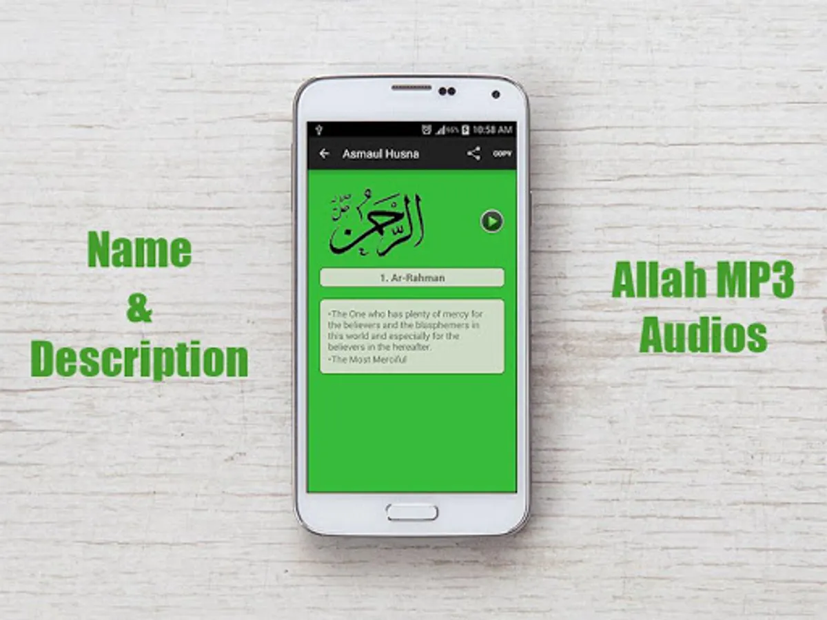 99 names of Allah are written in English and Arabic along with the meanings of each name in Arabic, English and Urdu. Install this android app today to get Asma ul husna, the beautiful names and attributes of Almighty Allah in English and Arabic along with the meanings of the names. Recite or memorize the 99 names of Allah any time any where from your phone.