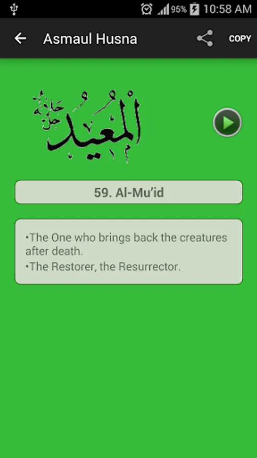 - For each name of Allah, a short English translation of Quranic-meaning is provided. Detailed meaning of each name is also provide within the app.