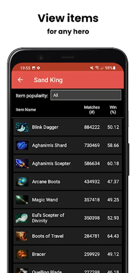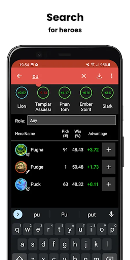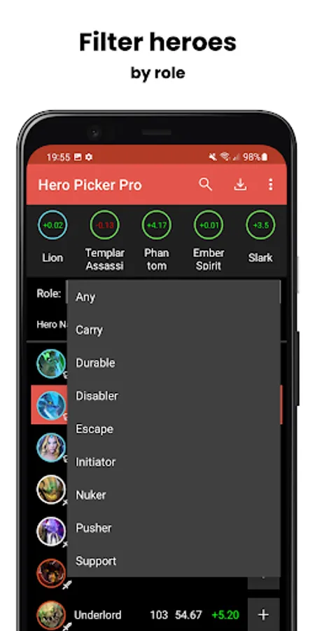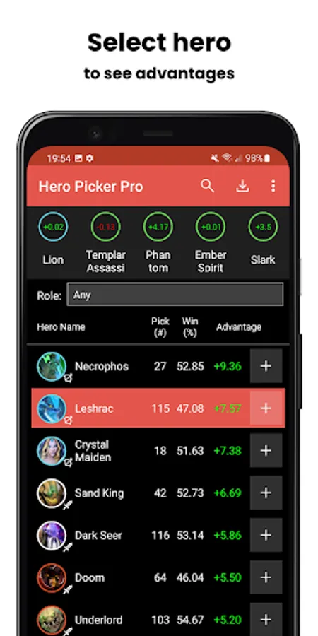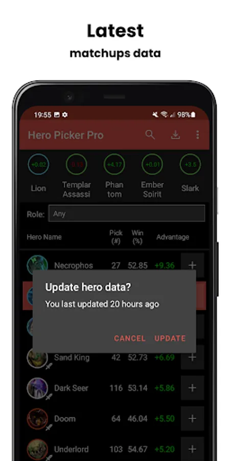 Our app regularly fetches matchup data to calculate the advantage of one hero over another, making it an easy pick for you to select the top draft counter hero against your opponent.