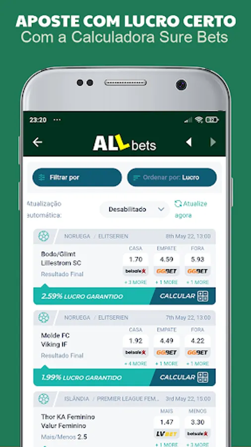 - Real-time information for you to place bets with a certain profit (Surebets);