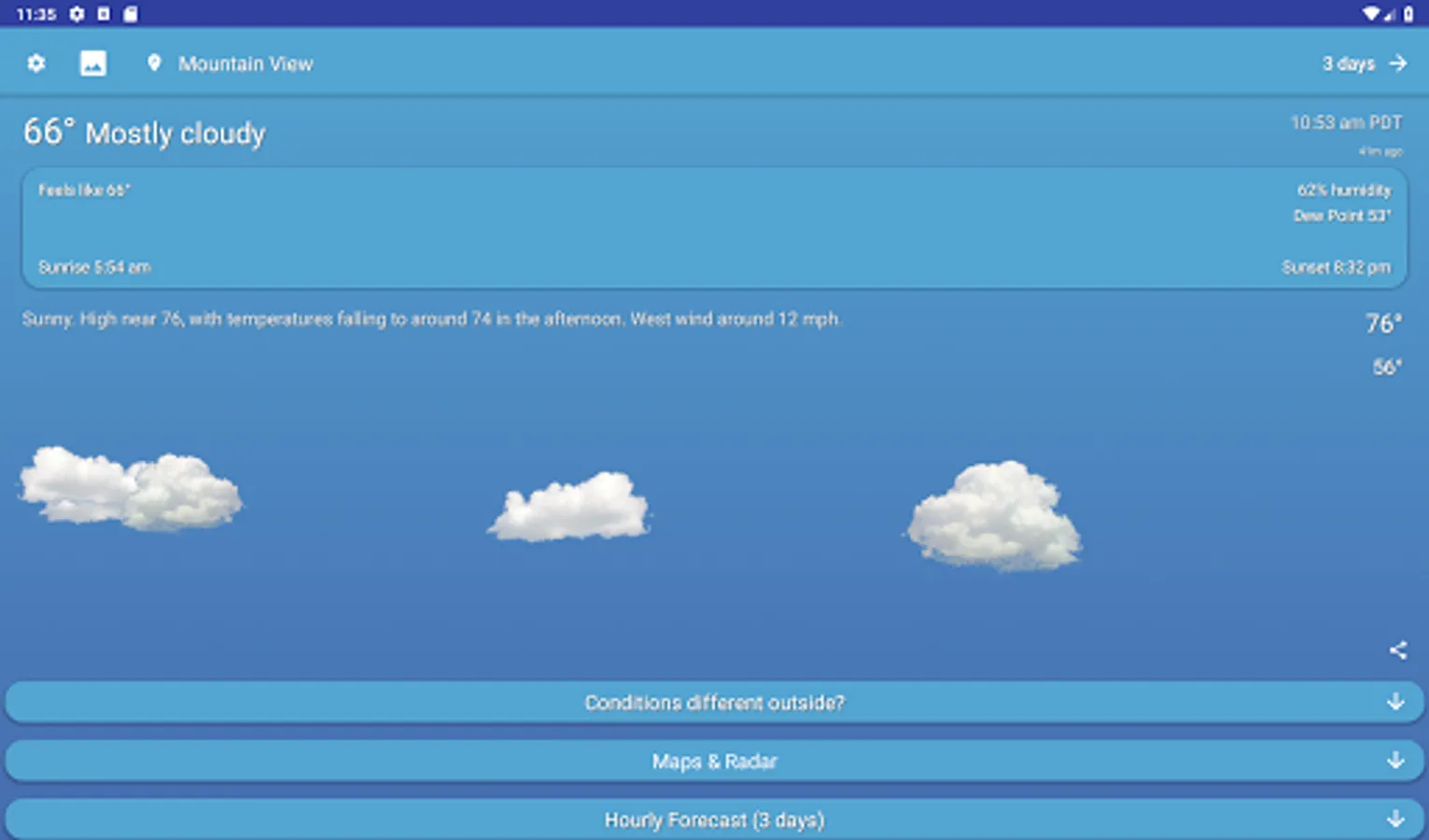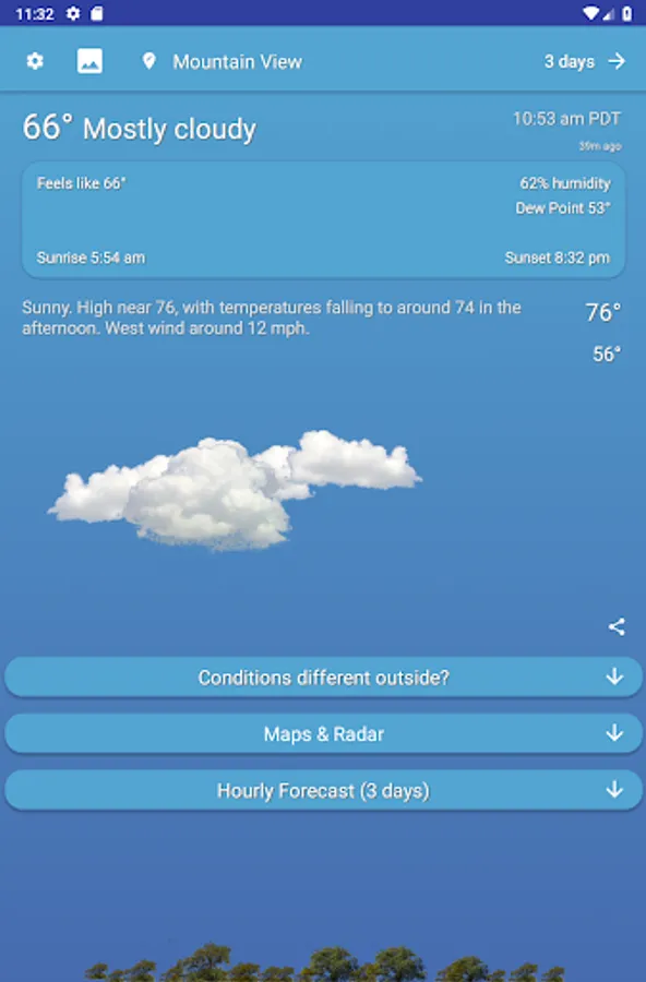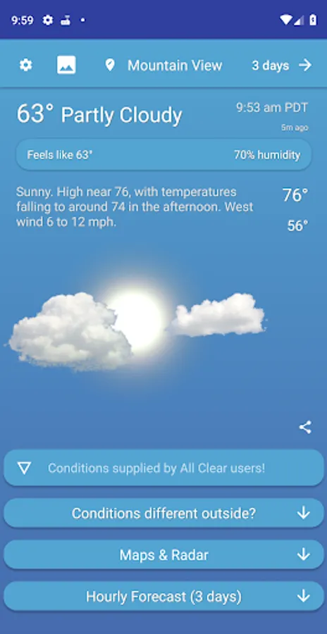 All Clear focuses on getting the weather right. What happens when the weather stations say it's raining, but for you it's sunny? Current conditions are updated quickly by our users - if you're near the crowd, you get the most accurate weather info possible! And if nobody else is nearby? Kickstart it by sending in the weather when it's wrong and inviting your friends!
