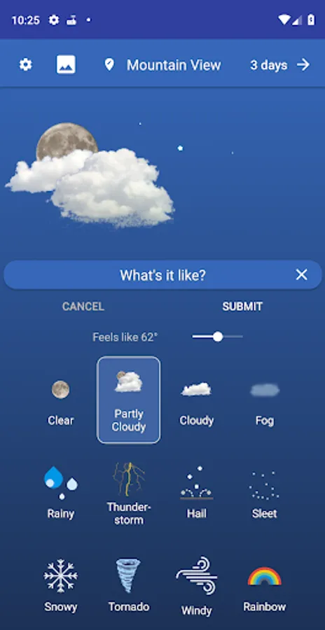 - Submit the Weather! Send in what kind of weather you're having. This lets other users nearby get a more accurate current conditions display. It also creates a new source of weather information that (in the future) could be fed to weather models for more accurate initial conditions.