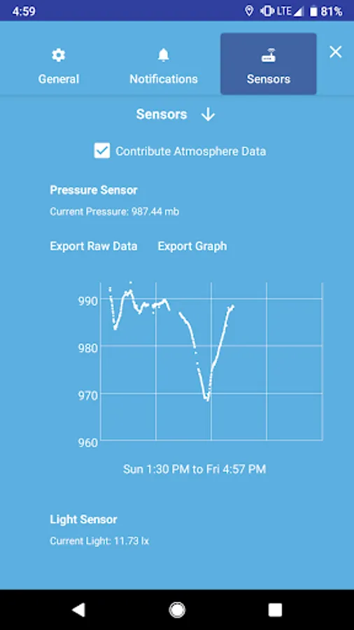 - (optional) Atmosphere sensor data collection from devices We support barometers, hygrometers, thermometers, and light sensors (luxometers!) in phones. You can watch graphs of your phone collecting this data and see how your device sensors react to the weather around you. We anonymize the data after it is sent to us, and we're building new weather products supported by the data.