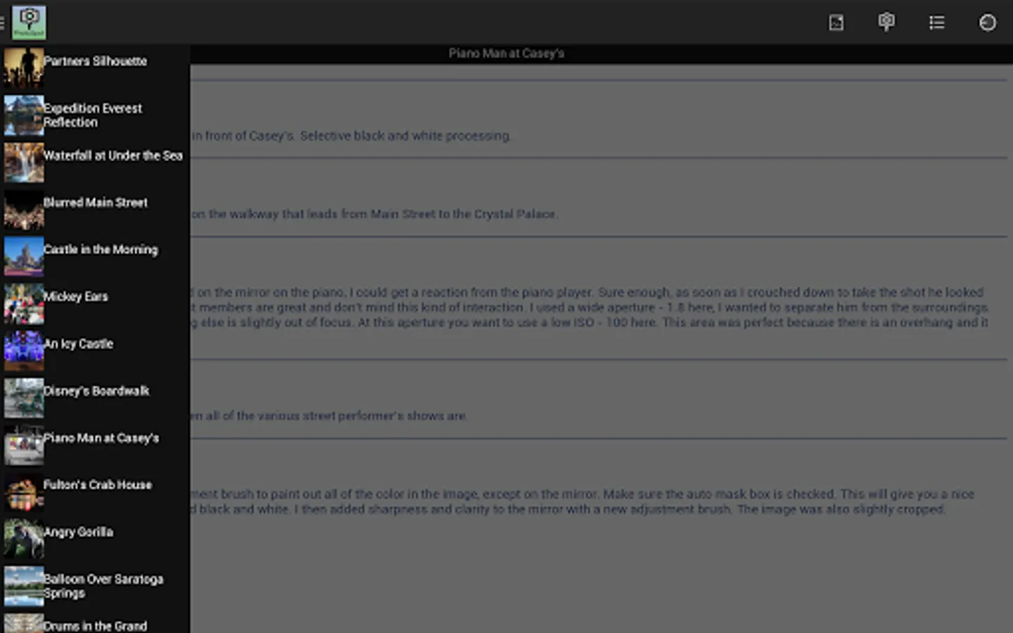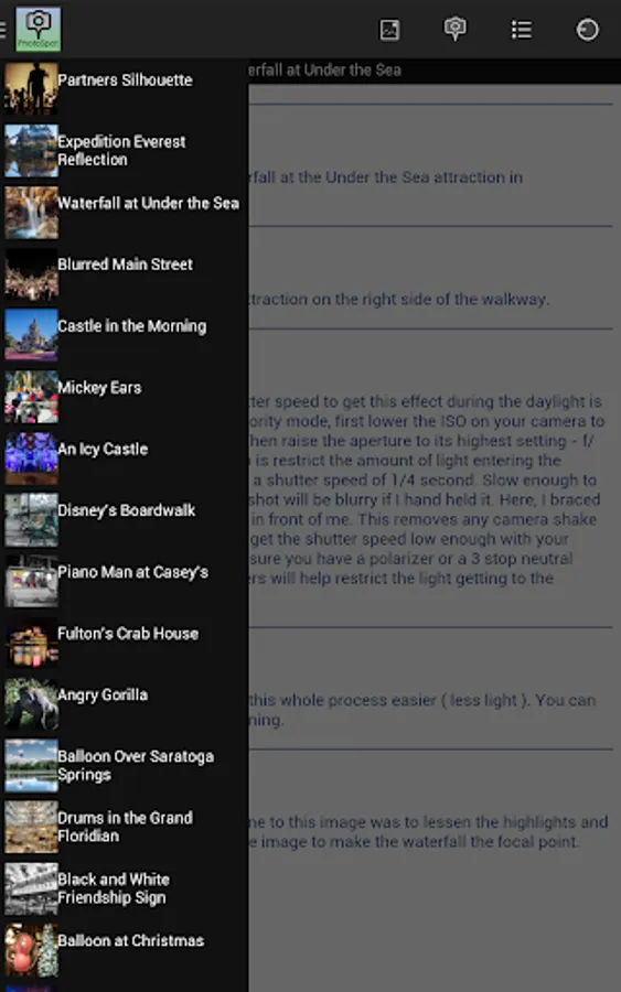 Walt Disney World, the most visited vacation spot on earth. Imagine being able to capture some of the magic of this resort through your own photography. PhotoSpot WDW was created to help you do just that. Within the different collections available, you will find beautiful photographs of some of the most popular and iconic parts of Walt Disney World, in addition to some out of the way and different photographic opportunities. The photographer will give you all of the photo details as well as some helpful tips and hints. He will explain the camera settings and why they were used. There is also a detailed, interactive map of every PhotoSpot in the collection. Hopefully with PhotoSpot WDW, the next time you are at the Walt Disney World Resort you will be able to take the type of pictures you've always dreamed of.