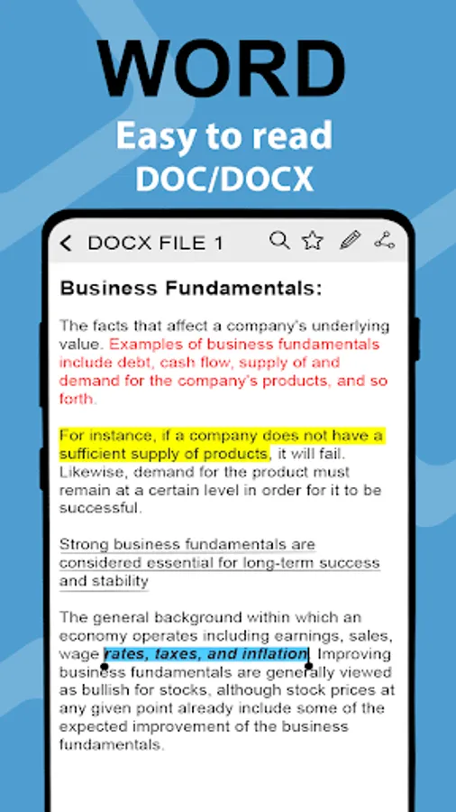 Docs viewer support reading .doc, .docm, .html, .docx, .dot, .odt, .txt, .wps, .pdf, .dotm, .rtf, .xml, and .xps file or edit any file with efficient documents reader for android.