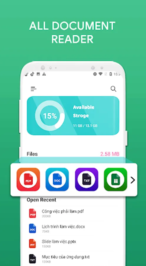 Can't open document file on your phone? All document viewer can help you to read all document files: PDF, WORD, EXCEL, PPT, TXT, XML...