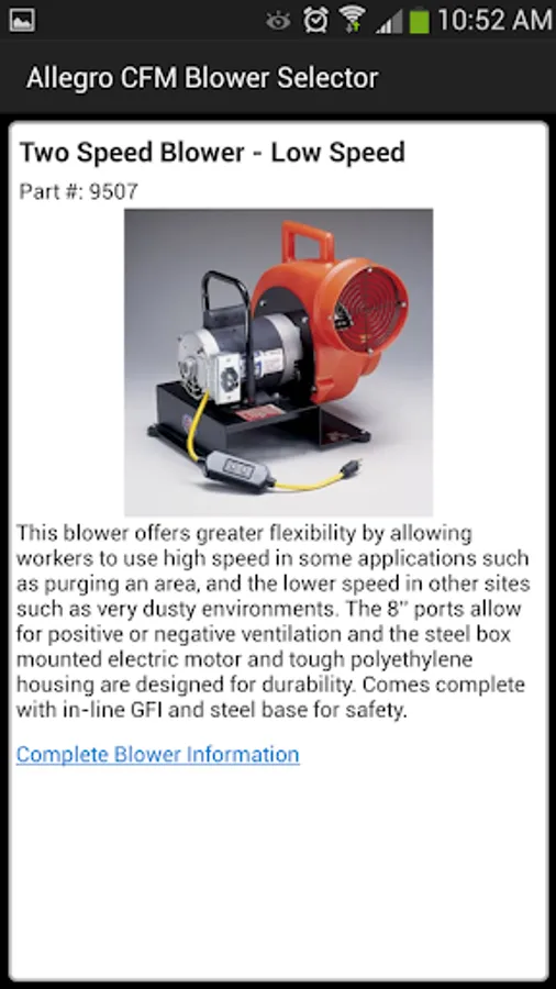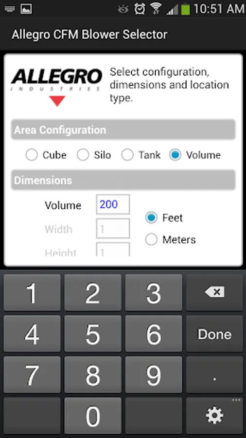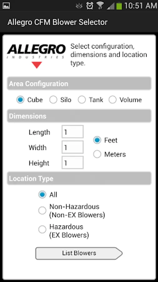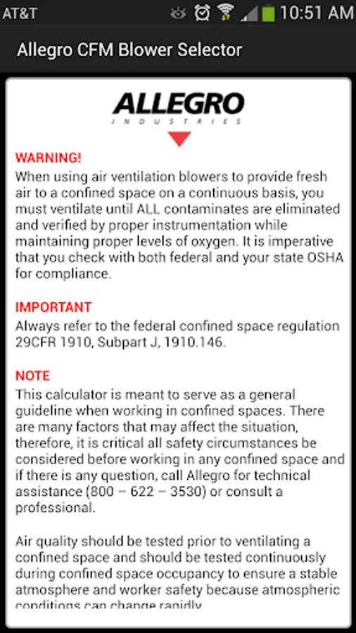 The Allegro CFM Blower Selector App takes into account the type of confined space environment you’re working in and its size to choose the proper Allegro blower that will best suit your needs. Allegro Blowers will then be displayed in green that provide the air flow and CFM (Cubic Feet per Minute) needed to properly ventilate the confined space.