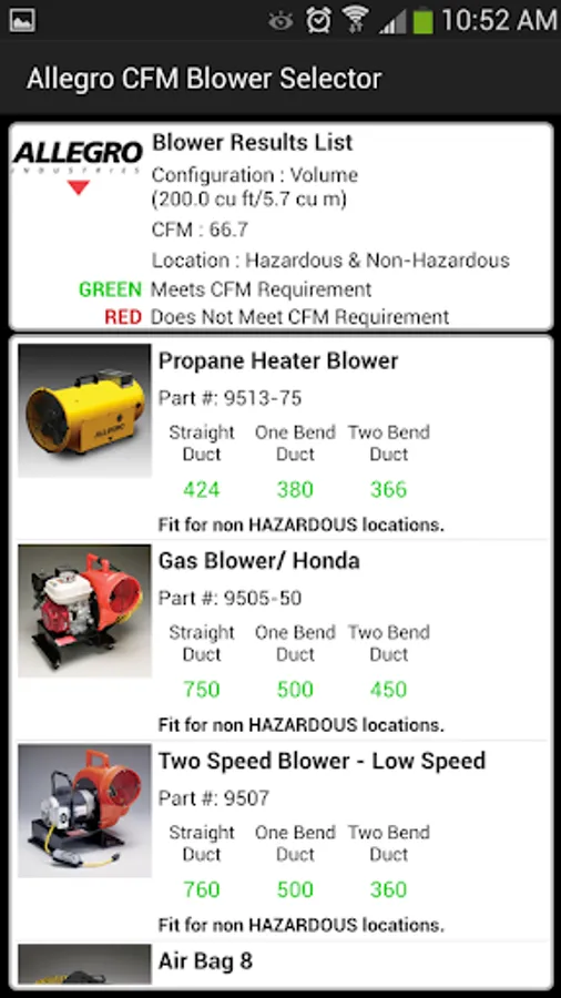 4. The app displays a list of Allegro Blowers that meet that requirement in green. Any that DO NOT meet the requirement are listed in red.