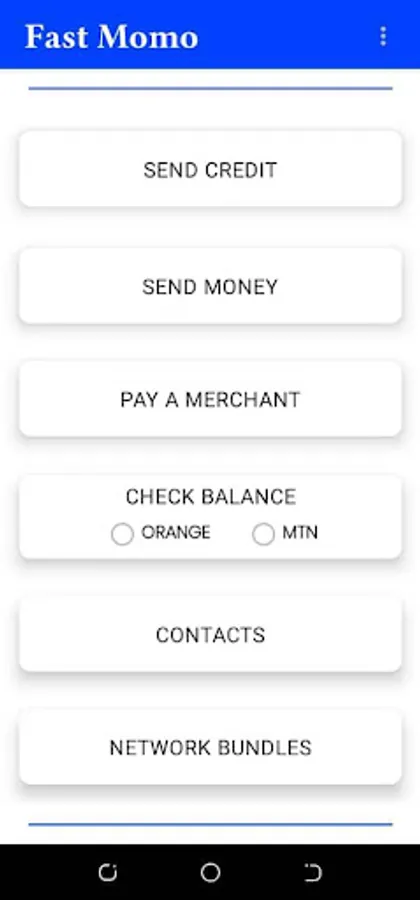 Fast Momo is an app that allows fast mobile money transfer, credit transfer, and subscriptions to network bundles (MTN, ORANGE, CAMTEL) without the use of typing long USSD codes. Fast momo specializes in saving the USSD code in your app and handling the user request to their respective network provider on their phone automatically.