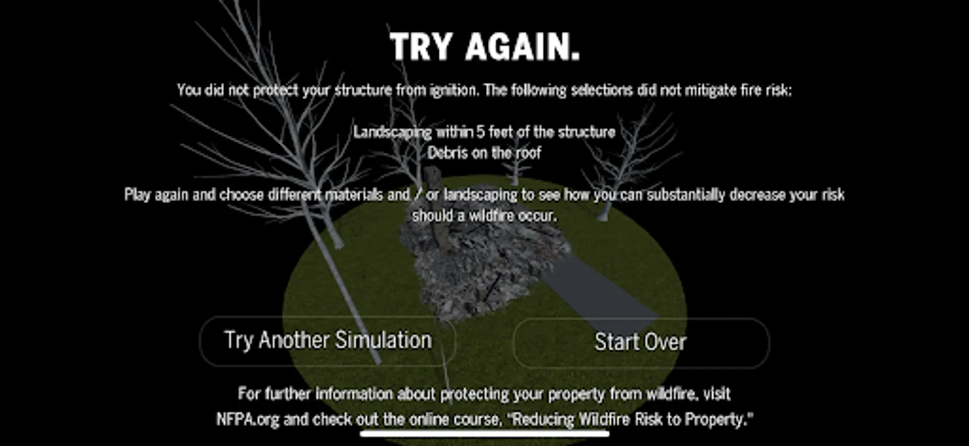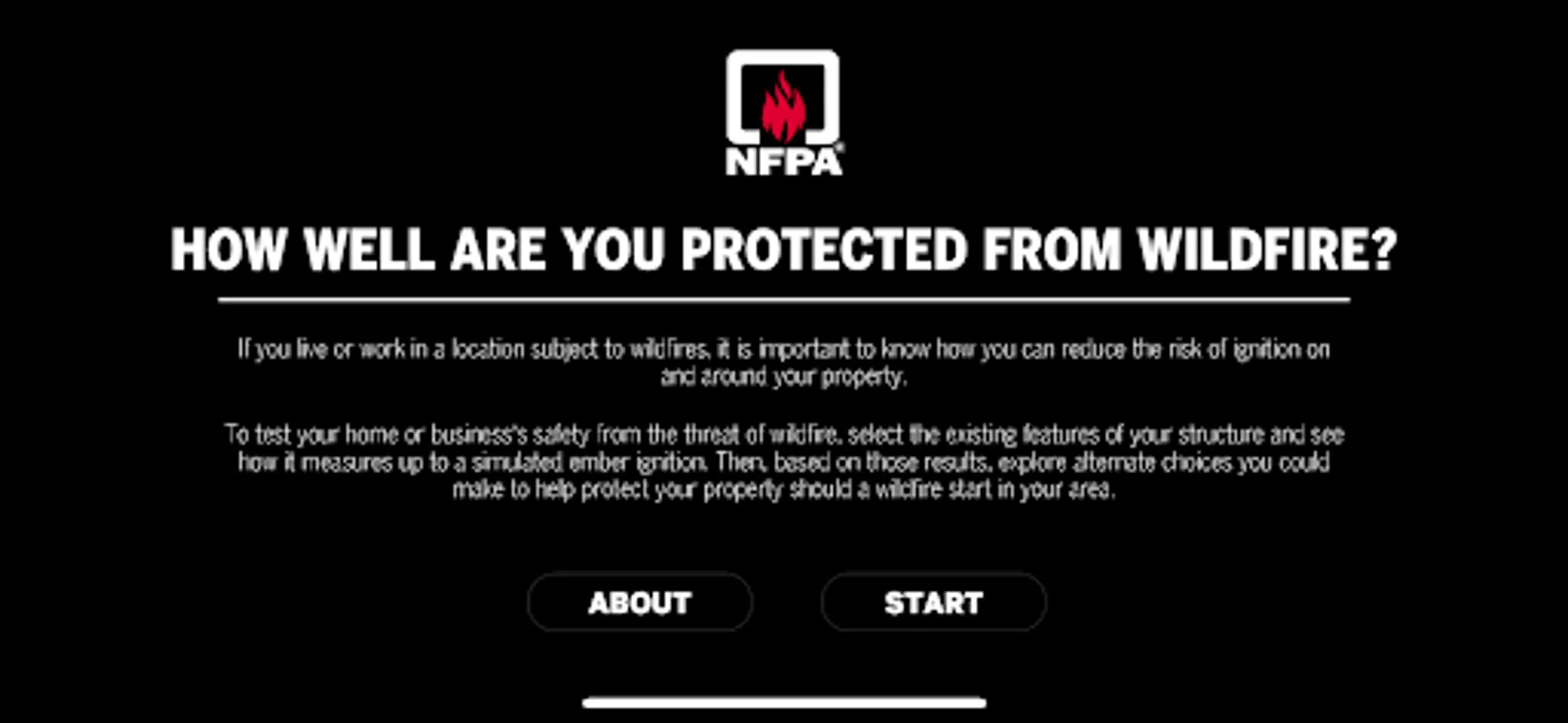 DISCLAIMER: The sole purpose of this simulation tool (“tool”) is to circulate information about some ways to help reduce wildfire risk. The tool cannot account for all factors that affect wildfire risk and anyone using this tool should rely on his or her own independent judgment or, as appropriate, seek the advice of a competent professional. It is provided AS IS and AS AVAILABLE without guarantee or warranty of any kind and without representation or warranty regarding the accuracy, completeness, usefulness, timeliness, reliability or appropriateness. NFPA assumes no responsibility or liability in connection with the information contained in or expressed by this tool, its use or output.