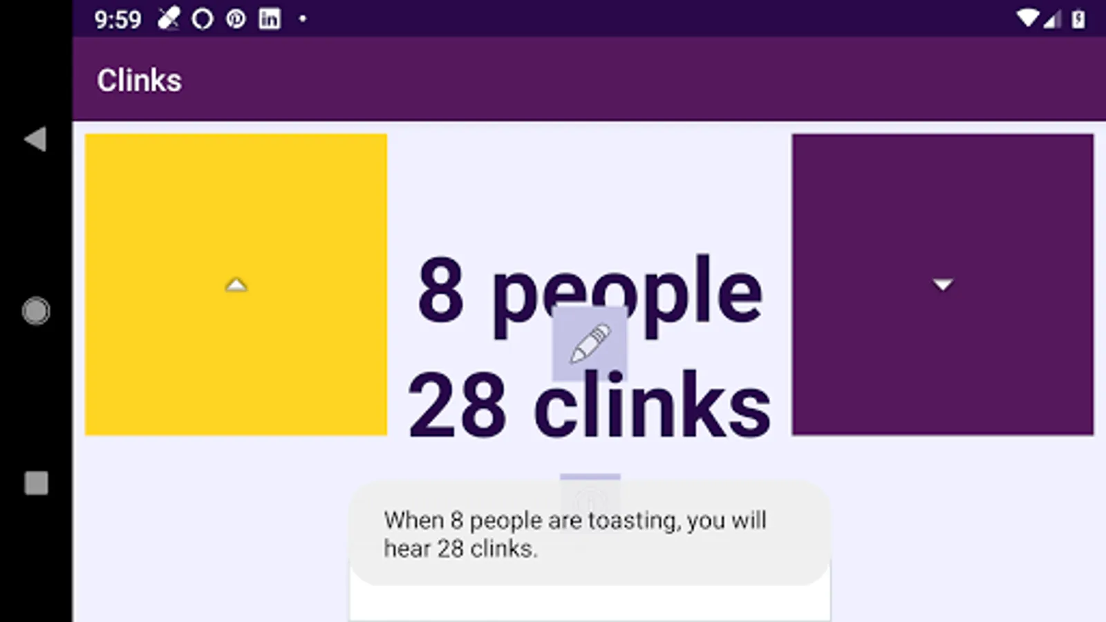 Ever wonder how many "clinks" you should hear, when people are doing a toast and "cheers"ing each other? This free app tells you!