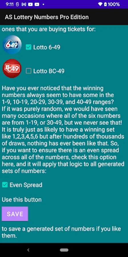 Just tell the app what kind of lottery game you are playing, by the range of numbers, and it will generate random sets. You can then save sets of numbers. You can check if any number sets have ever won in the Lotto 6-49 or BC/49 games. More lotteries will be added in the future.