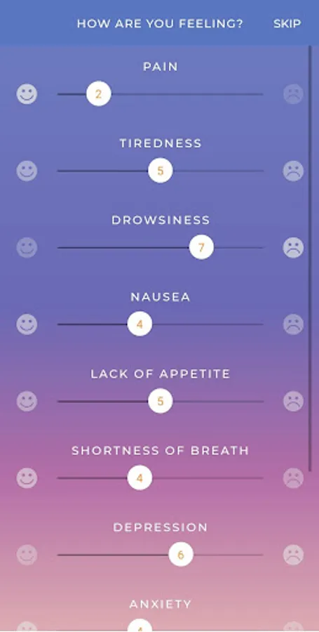 In addition to the practices, the app invites you to fill in a simple monthly survey of how you are personally tracking across 10 indicators: pain, tiredness, nausea, drowsiness, lack of appetite, shortness of breath, depression, anxiety and wellbeing. It then provides you with feedback regarding how these indicators change in relation to the frequency of your practice.