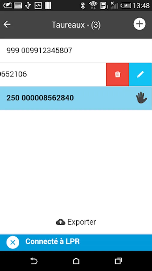 It allows you to very easily create list of animals by recording each EID reading coming from the reader or by adding manually a number. You can then export this list by email (CSV file format).