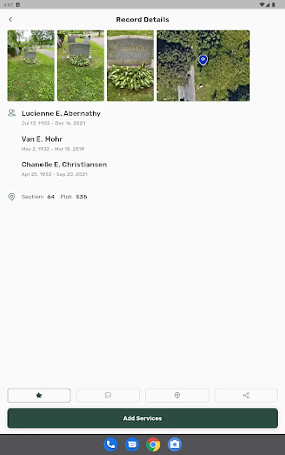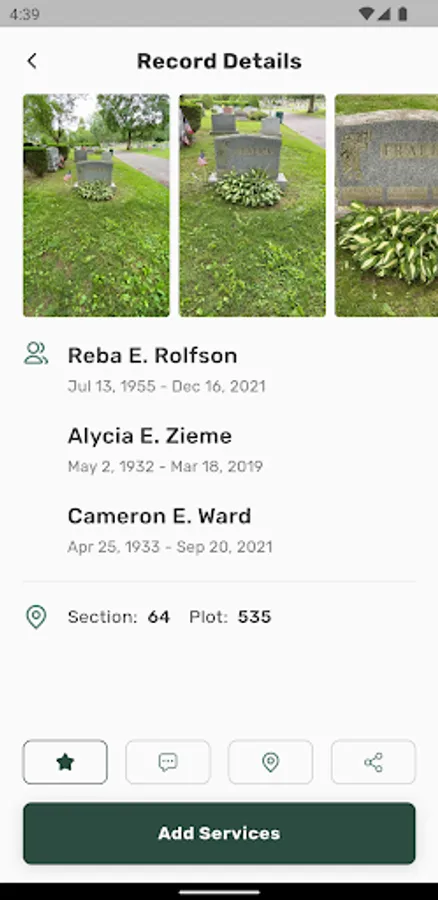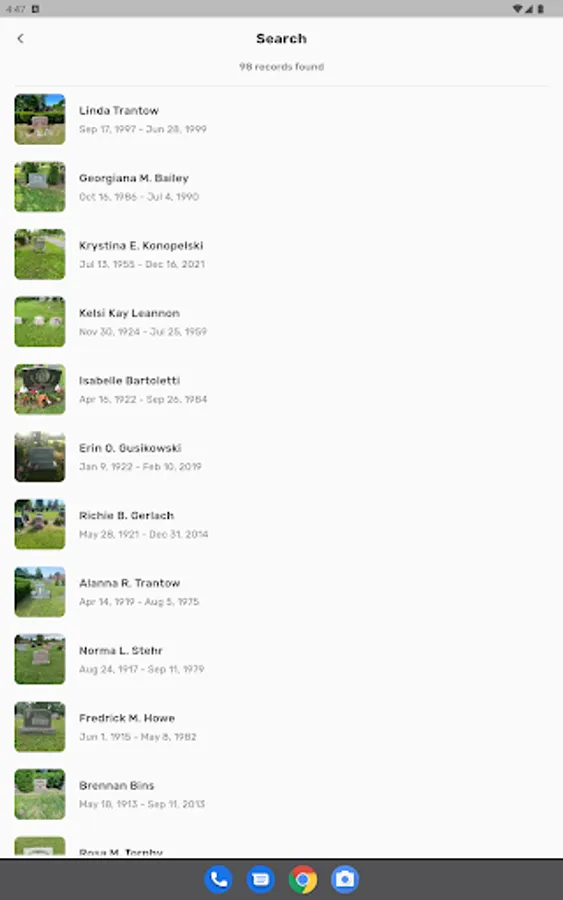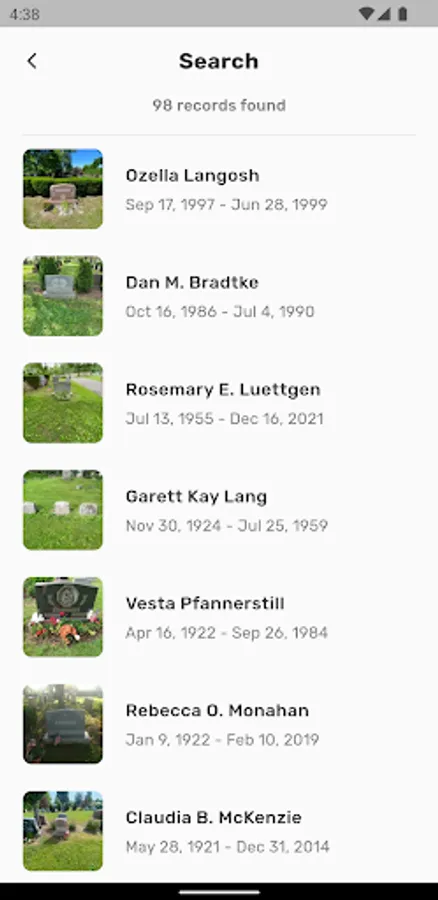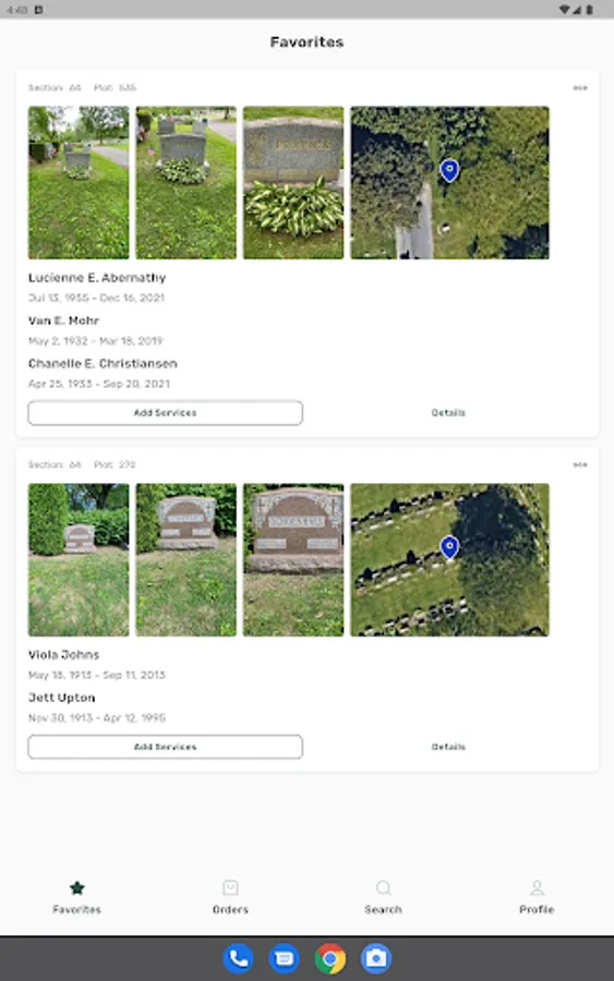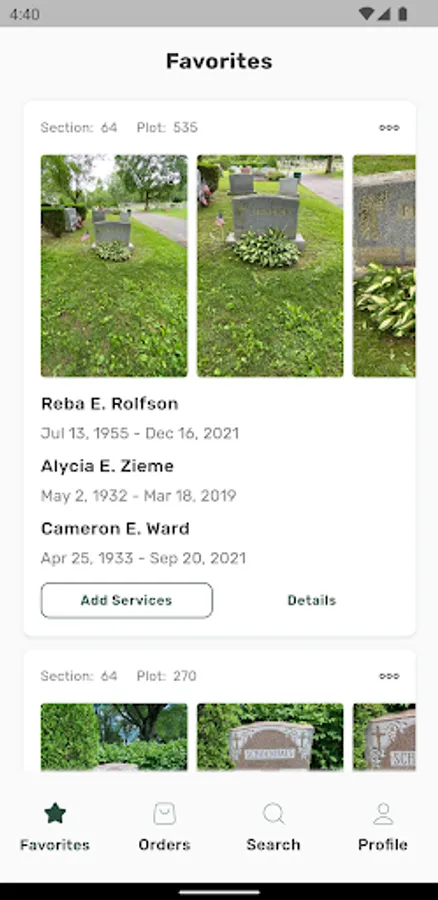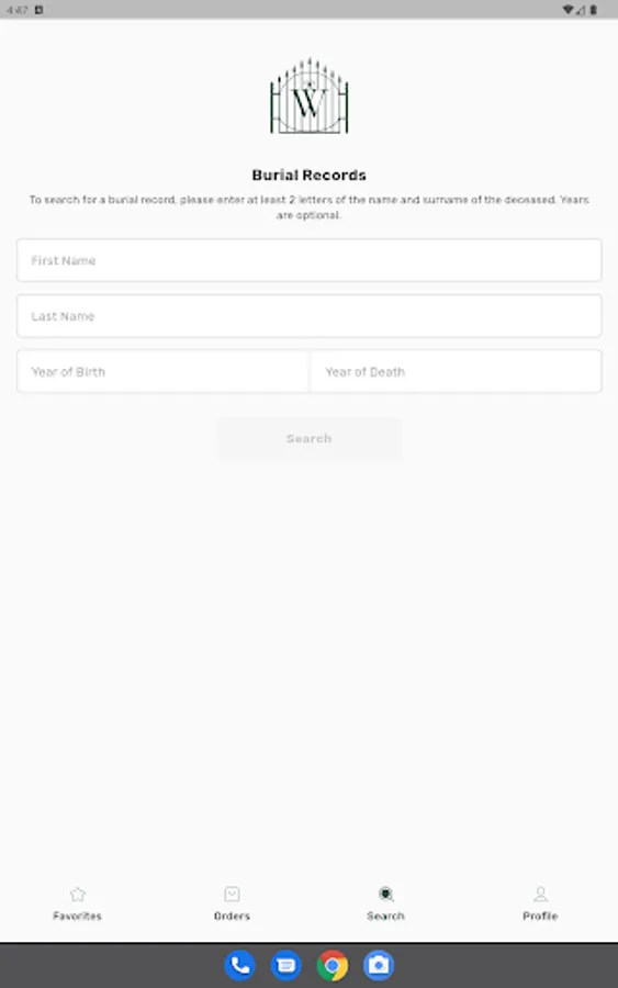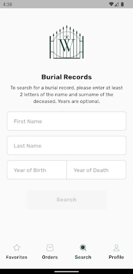 Woodlawn Cemetery App allows users to search a definitive collection of burial records and get basic information about relatives interred here. After registration, you can contact the cemetery, add records to favorites and order aftercare services.