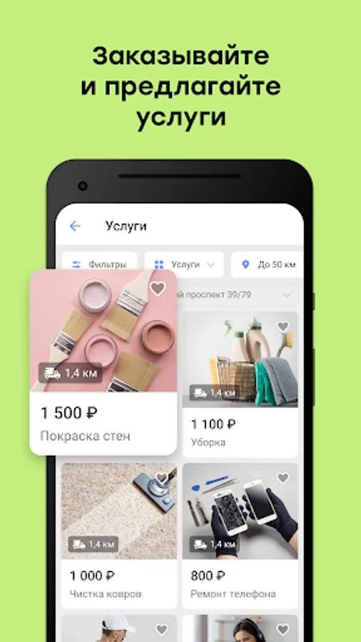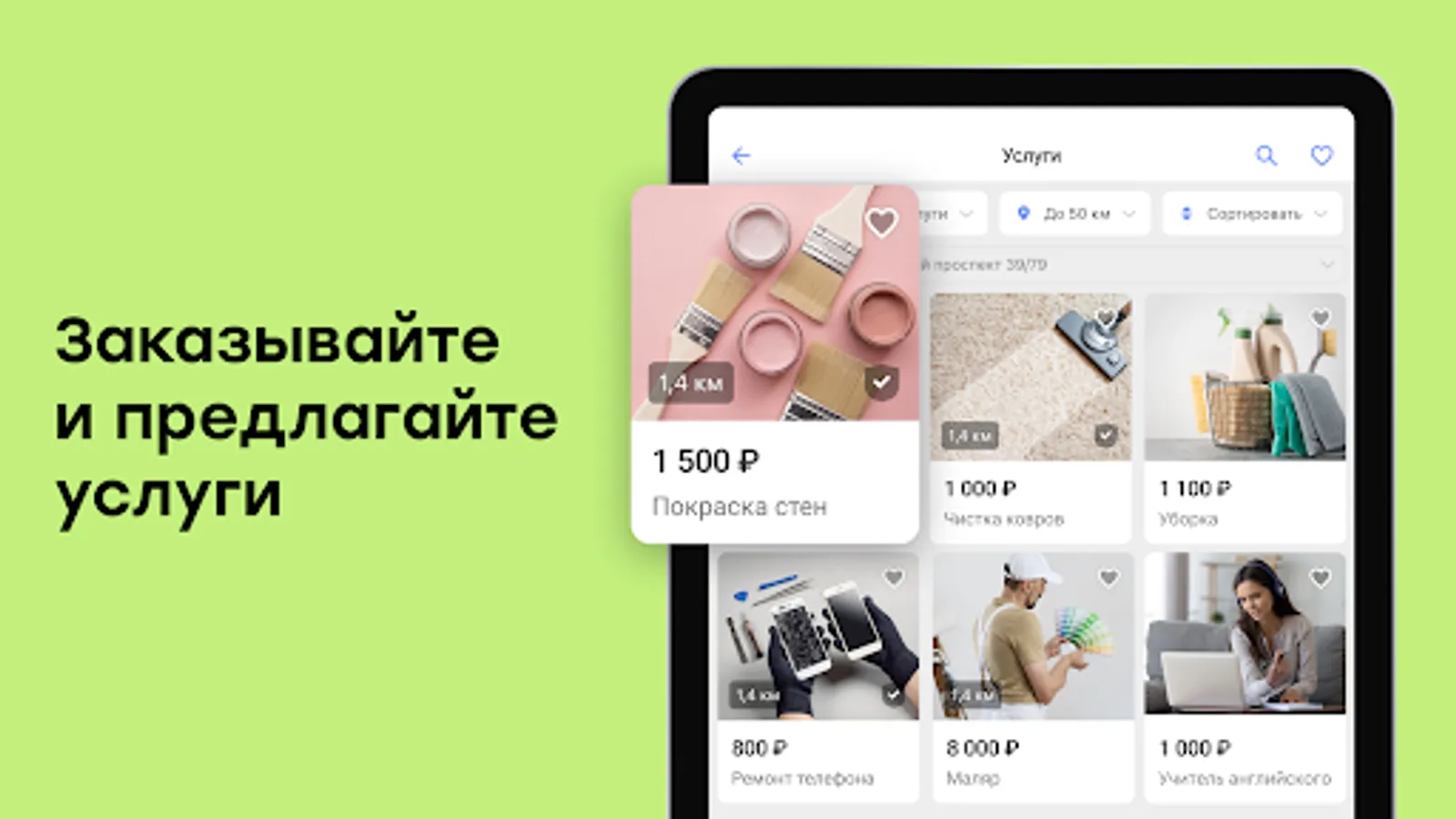 Offer your services or buy someone else’s. Thousands of services are promoted via Youla: from cleaning and repair services to manicure and pedicure. You can easily find a professional for any task next to you. Interpreters, experienced private tutors or cleaning specialists can quickly find new customers by our service. Millions of users open our app every day to find a specialist they need.
