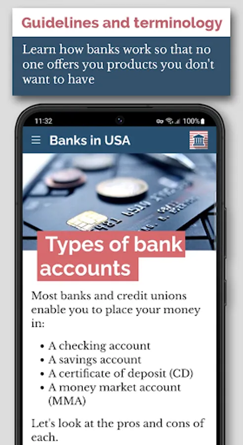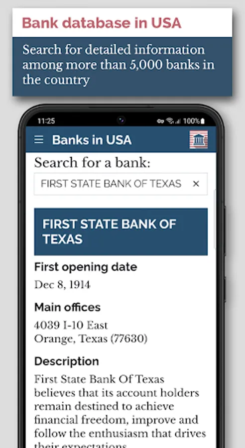 Banks in USA" is an application that will help you to find the bank you need. With more than 5000 banks in its database, you will be able to access the most relevant information and a description of each one of them.