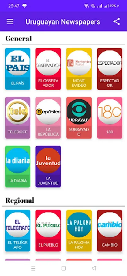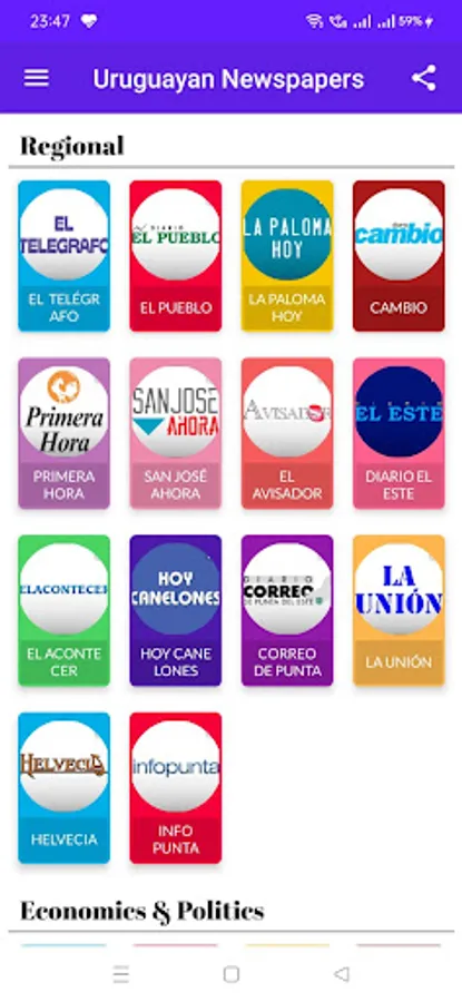 Newspapers are categorized and grouped for better experience. In this way, you can read el país and, from this one, you can move to other newspapers of the same category (el observador or montevideo portal) by moving up the lower menu. You are going to be able to compare how different newspapers analyze the same news. You can also find important regional newspapers such as el telegrafo or diario el pueblo in the "Regional" category. We also have financial and political sections (you can read these news at cromo or lared21) and, sports fans have ovación and referí.