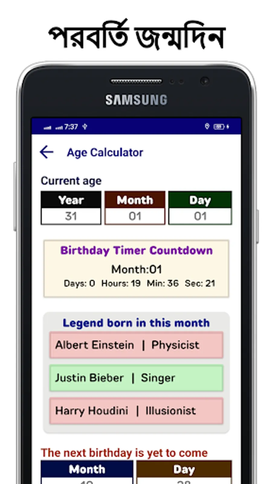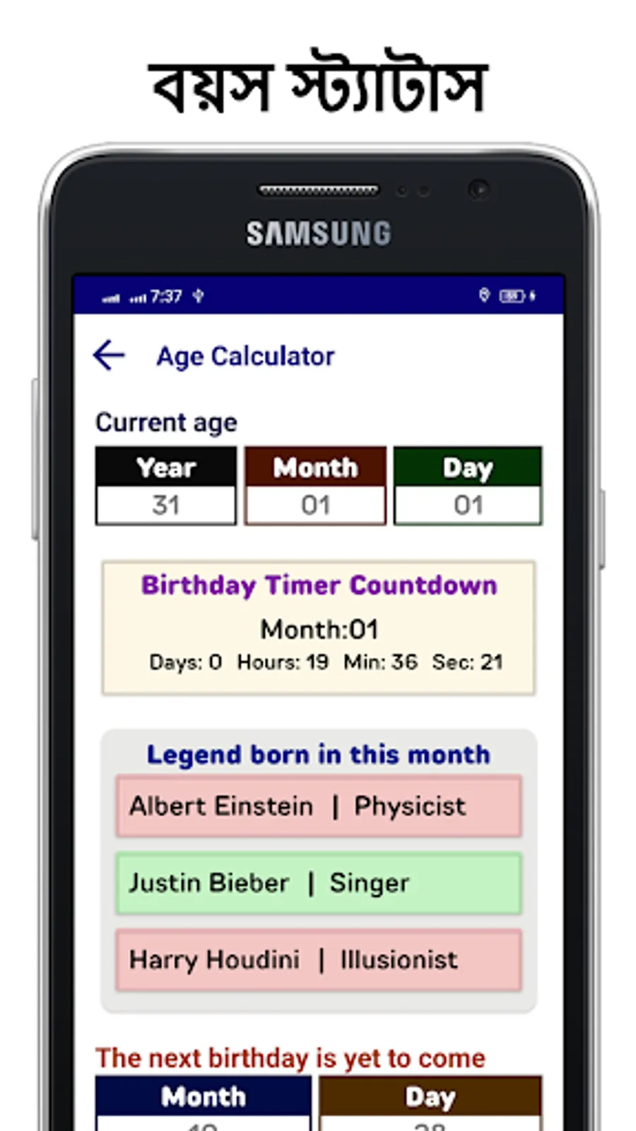 এ ছাড়া আপনার জন্ম দিন আসতে আর কত দিন কত মাস বাকি তার ও হিসাব পাবেন, সাথে আগামি ১০ বছরেরর জন্ম দিনের তারিখ এবং কি বার তাও জানতে পারবেন।