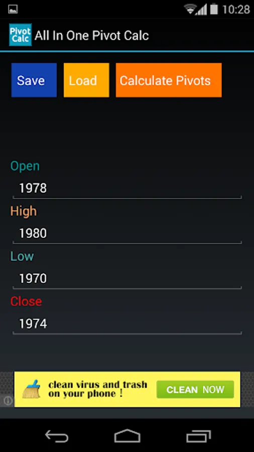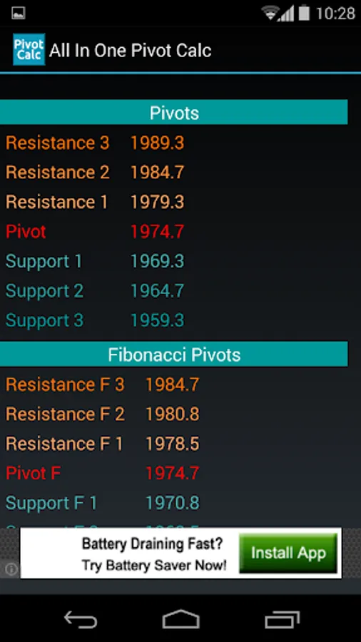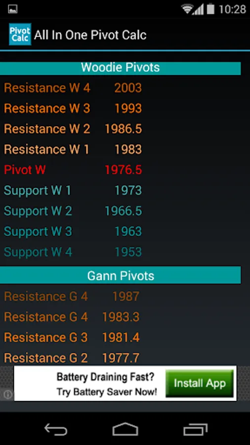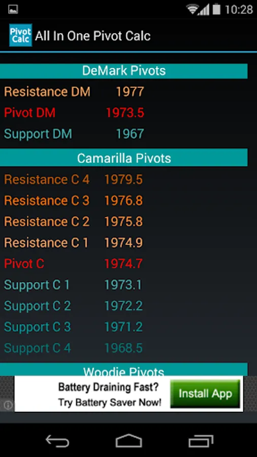 With this app you can calculate the most important pivots according to the values you enter: open, high, low and close. You'll get the support and resistance levels according to most estimates used in the financial world: