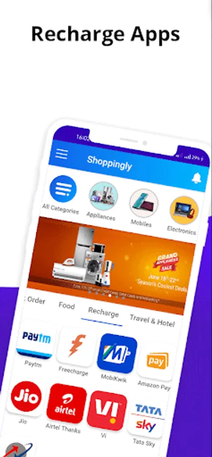 The all in one shopping app allows you to recharge your phone from reliable sites and Apps like Paytm, Freecharge Mobikwikm, Jio, etc.