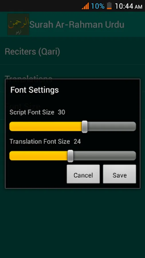 • Adjustable font size for both Arabic and Urdu.