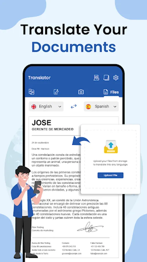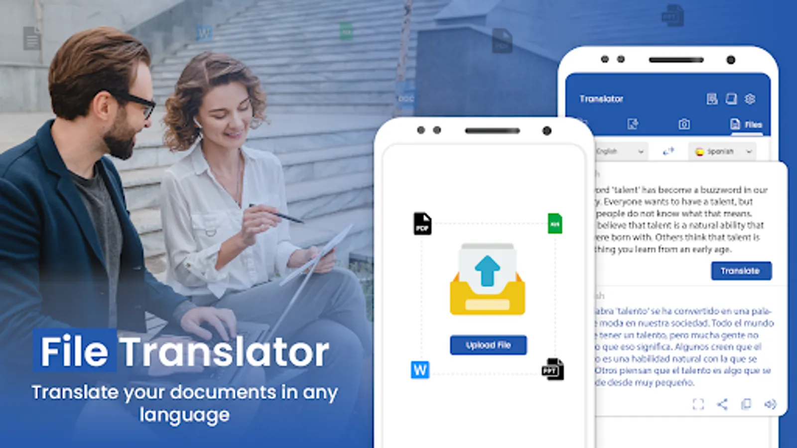 All Language Translation App is a complete solution for all your file translation needs. Effortlessly upload and translate various file types, including documents, presentations, and spreadsheets. This ensures that your documents, presentations, reports, and other file types are translated with remarkable accuracy. Our File Translation service supports an extensive range of file types, including Microsoft Word documents, PowerPoint presentations, Excel spreadsheets, PDFs. You can simply upload your file, select the source and target languages. You'll receive a translated file that respects original formatting and design, allowing you to share your message confidently.