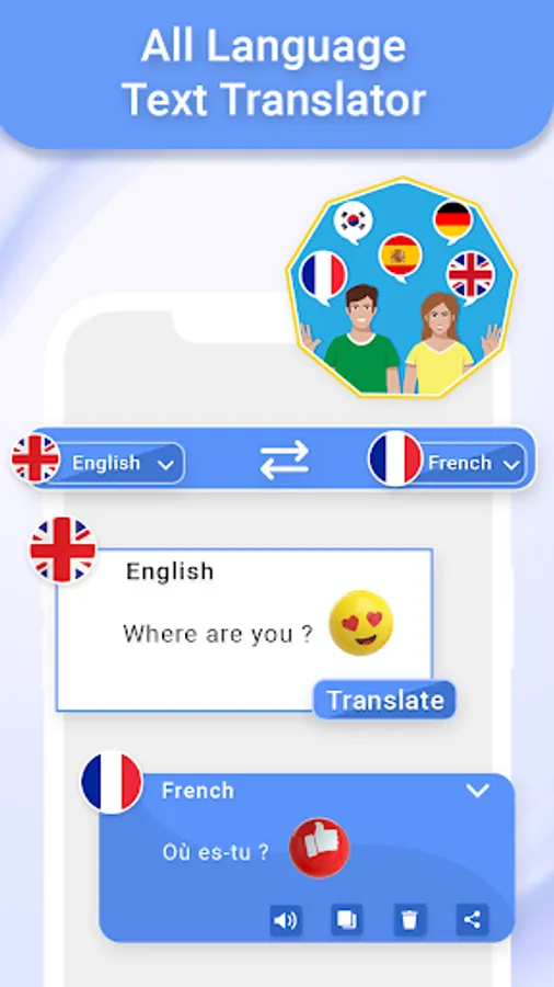 All language text translator assists you in translations of text in 100+ languages, you can translate small & large paragraphs without any translation limit. Text translator helps in translation long texts, copying translated text & sharing it on other apps on just one tap. Text translator also support text to speech feature in which translated text is spoken aloud to help you in understanding the pronunciation of words.