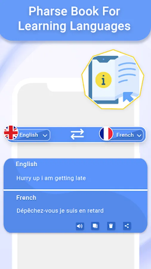 Pharse book is an exclusive feature of all language translator which assists in learning different language through predefined sentences that are used frequently