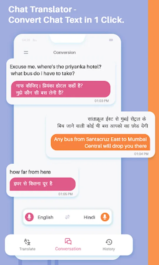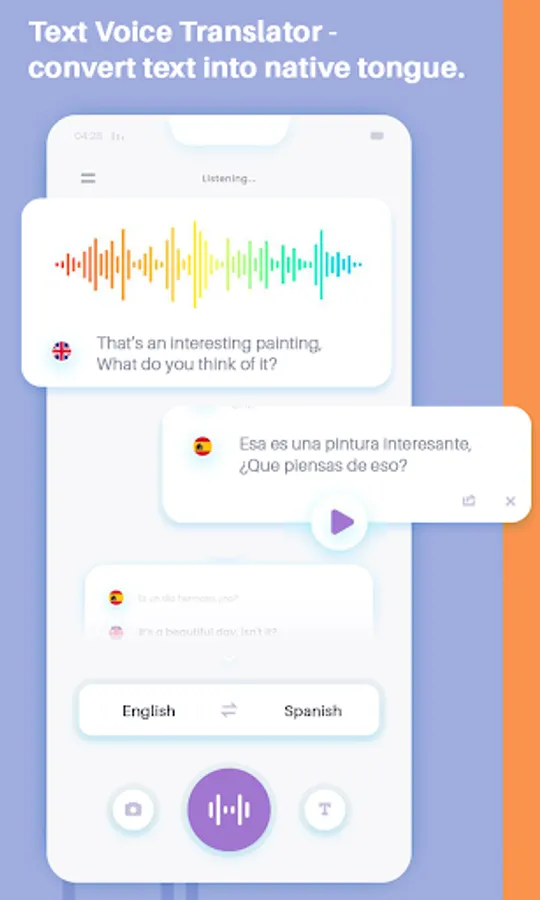 Just speak and translate your voice into many languages. Chat mode for a conversation between two people. Just speak your text to translate it into the desired global language. A live voice translator tool that can translate into any language is called speech and written content interchange. The universal language translator is perfect for chat translate in any language.