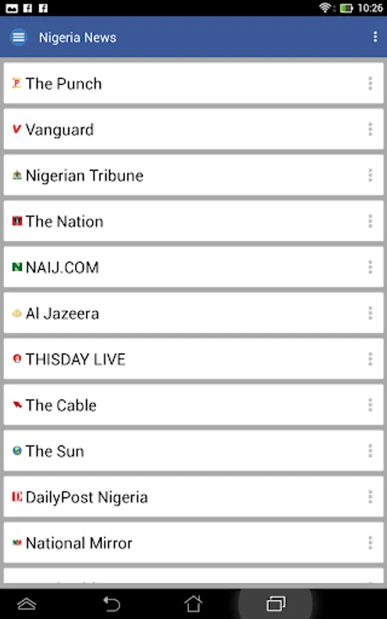 Naij,The Punch, Vanguard, Pulse.ng, Premium Times, THISDAY LIVE, Information Nigeria, The Nation, The Guardian Nigeria, Leadership, Daily Times Nigeria, The Sun, P.M. News Nigeria, DailyPost Nigeria, Nigerian Bulletin, Nigerian Tribune, Al Jazeera, The Cable, National Mirror, Online Nigeria, Goal, Masterweb Reports, BusinessDay, Jaguda.com, YNaija, Bella Naija, Channels TV, Hallmarknews, Latest Nigerian News, Peoples Daily, Sahara Reporters, The Net, The Trent, 36NG, 360nobs, OSUN DEFENDER, CNN.com, BBC, Reuters, Huffington Post, BuzzFeed, FOX News, New York Times, ABC News, Washington Post, Telegraph, The Independent, Mail Online, Wall Street Journal, CNET News, TechCrunch, Digg, GSM Arena, Tom's Hardware, WIRED, allAfrica.com, Business Insider, Forbes, The Guardian, The Economist