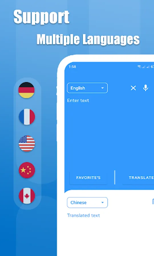 Offline language translator has a main screen in which they have multiple buttons and a text view. Translator master all language and have three buttons