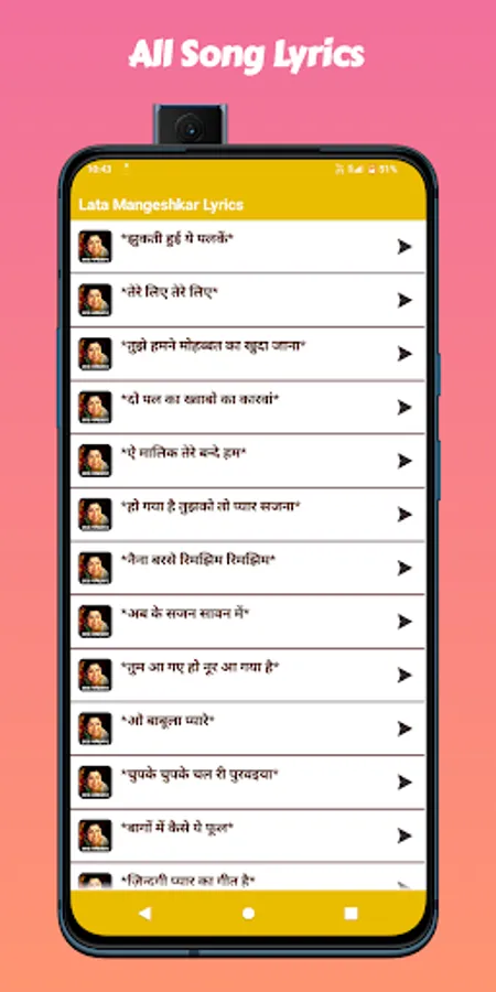 Lata Old Hindi Songs Lyrics app is best for the fans of Lata Mangeshkar, who is the most respected and popular play back singer in India. She recorded songs Lyrics for more than 1000 Indian movies. The great songs Lyrics of Lata are still popular in all over India as well as sub-continent.