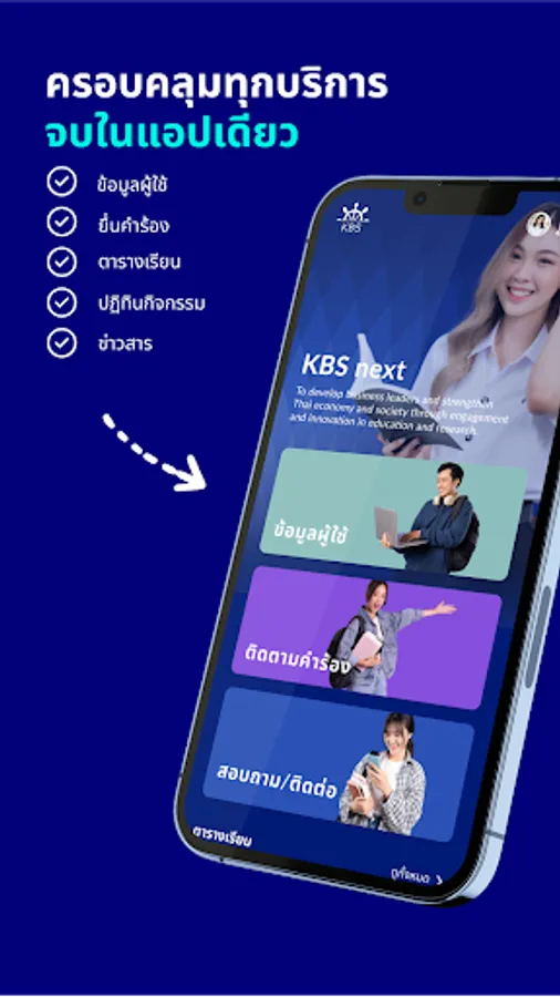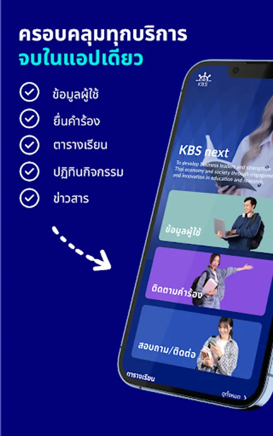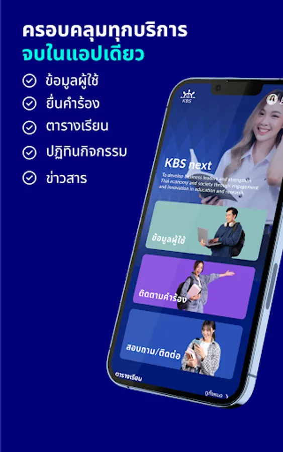 KBS NEXT Application for students of the Faculty of Business Administration Kasetsart University that is linked to information and facilitates in university life Both in terms of educational services such as academic calendars, application documents, class schedules, exam schedules, academic results, up to date with all news and events.