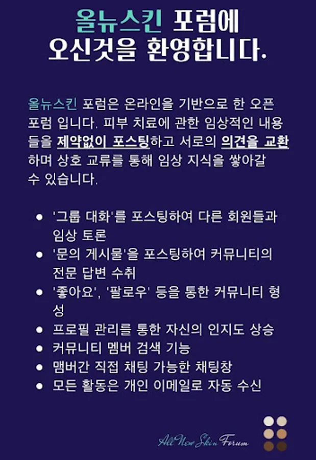 Allnew Skin Forum is an open forum based on online. You can post clinical information about skin treatment without restrictions, exchange opinions, and build clinical knowledge through mutual exchange.