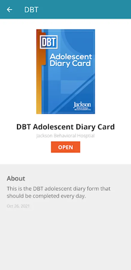 DBT for Adolescents is a new tool that provides all the tools one needs to participate in Dialectical Behavior Therapy. Users can learn important behavioral skills, record their experience applying those skills in a daily journal, and even share their journal with their DBT counselor. Interested behavioral health professionals can contact the app publisher about gaining access to our clinician dashboard in order to use this app with their clients.