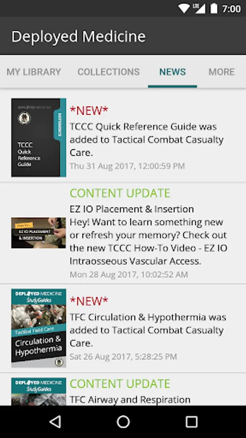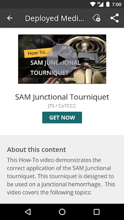 The medical content currently focuses on tactical combat casualty care (TCCC) training for combat medical personnel, and includes topics, such as hemorrhage control, airway management, hypothermia, pain control and care of wounds and splinting etc. TCCC focuses of providing the information you need to know to assess, treat and stabilize a patient at the point of injury.