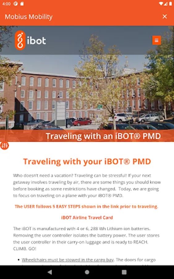 iBOT Personal Mobility Device is a multi-modal mobility device designed for indoor and outdoor use. Navigate various terrain, interact at eye level, and climb stairs! The iBOT Training Program supports iBOT User and Clinician Training, updates, and reference material maintenance/service of the iBOT through a self-led training videos and documents.