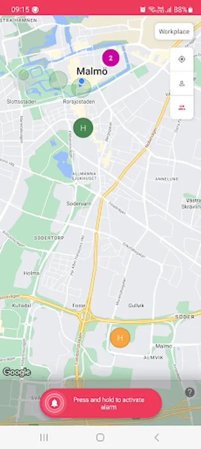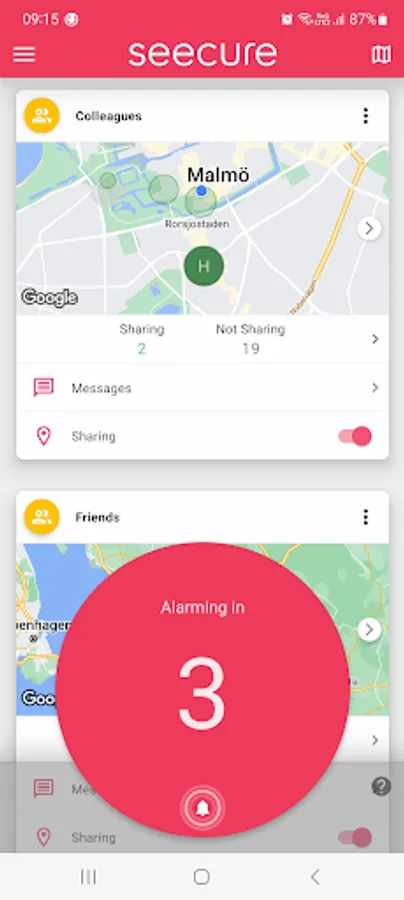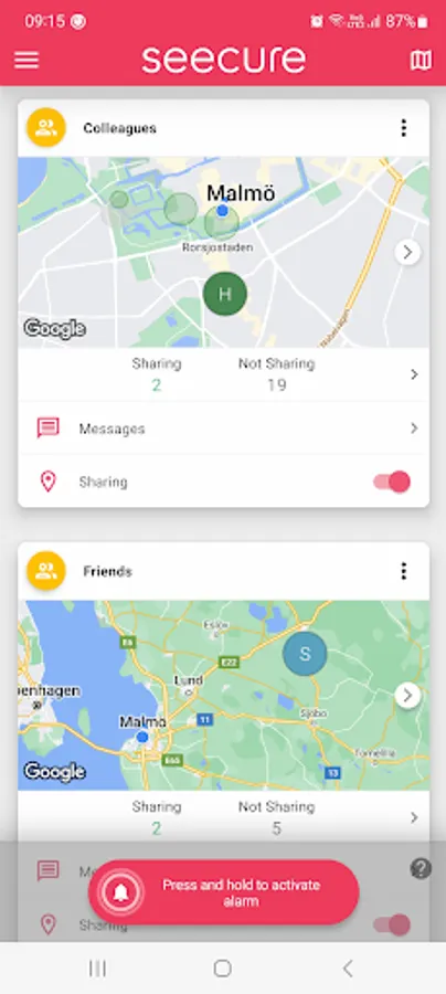 Alarms can be activated in the app whenever you need help, instantly sending multiple alarm notifications to your selected contacts. When receiving an alarm, you will be shown the location of the user that activated the alarm.