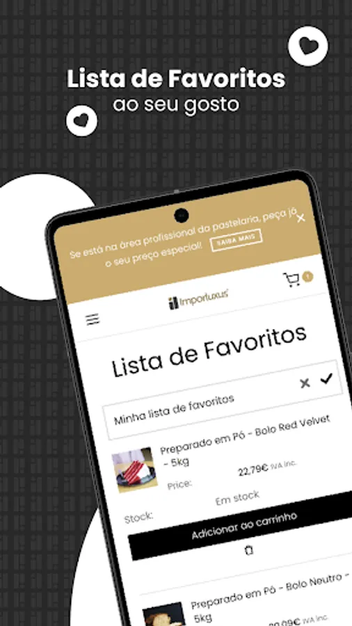 The Imporluxus app is the easiest and fastest way to access our online store via your mobile phone. Explore all our pastry products, disposables, equipment and utensils. Always stay up to date with the latest news and promotions! Search for your favorite products by SKU. Download the application now and start making your cakes a work of art, everything you need for your cakes in one place!