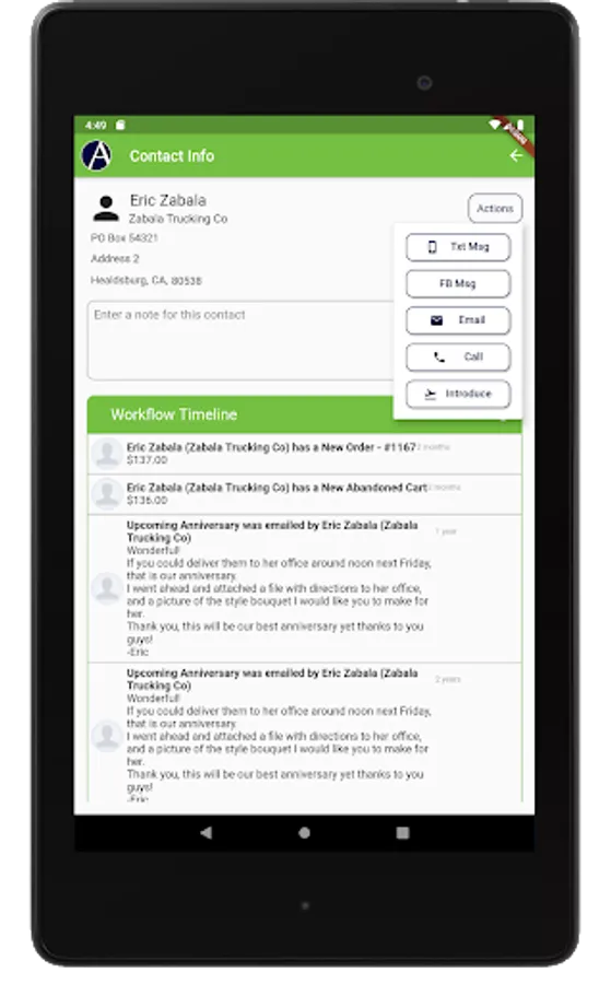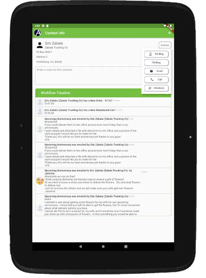 Look up customer information and see a complete history with ALL of their communications with your team - All emails, text messages, phone calls, and facebook messages. Record notes on client records. You can also see tasks that your staff are working on and staff clock in and out times.