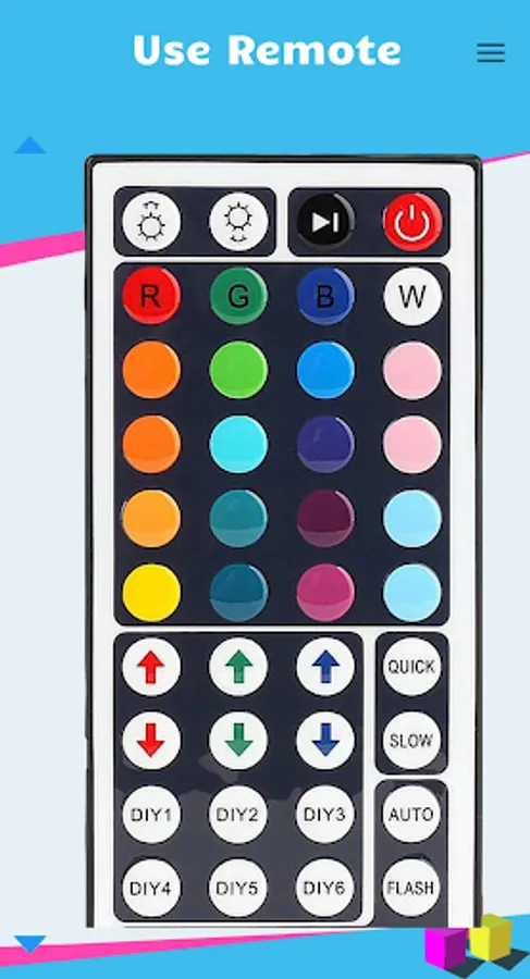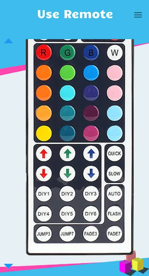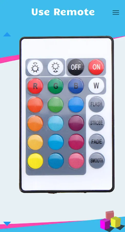An app to control IR lighting devices, such as RGB stripes and LED lights that is powerful and easy-to-use. It features an intuitive interface, so all You have to do is pick a remote that appears to be like Yours and start using it!