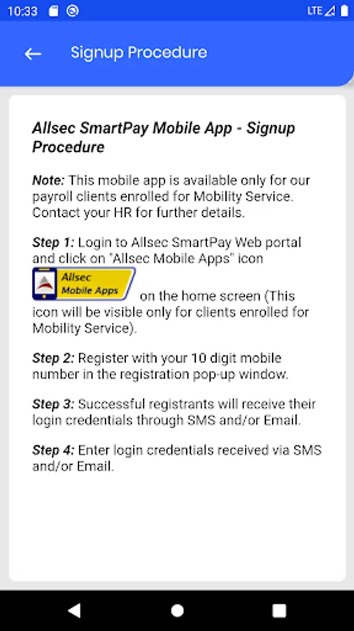 Allsec Smartpay Mobile Services is an unified App and an extended feature of Smartpay Employee Self Service (ESS) portal that helps employees to access their Payroll Information on the move. Features & functionality of ESS are limited in this delivery channel. Access to this service is provided based on the HRO solution offered as part of our services to your employer.