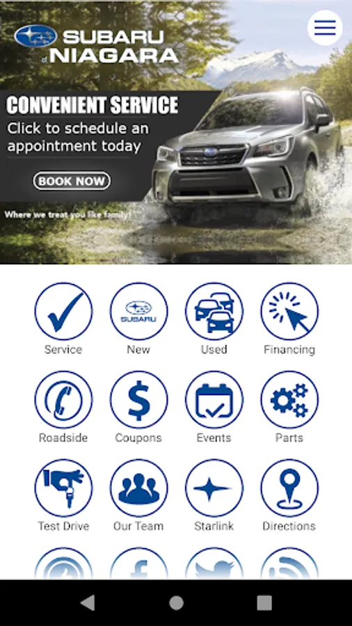 Subaru of Niagara mobile dealer app provides customers and shoppers with an enhanced dealership mobile experience. The mobile car dealership app uses background geo-location for geo-fencing and geo-targeted push notifications to provide customers with relevant specials and loyalty offers. The app also delivers a wide range of features/benefits to customers, including service scheduling, viewing new and used inventory, redeeming mobile offers, sharing dealer promotions, referring family and friends, viewing special events, contacting roadside assistance, booking a test drive, and contacting staff directory.