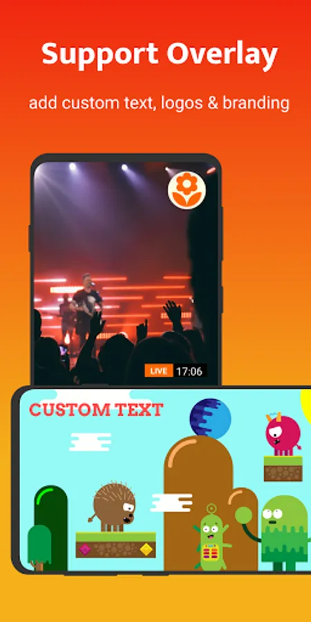 * Camera Live: show your personality, talent, or passion to your fans, viewers, subscribers or friends. You can switch between front and rear cameras without interrupting the stream. Enhance your video with overlays, adding custom text, logos, images, timestamps, and branding.