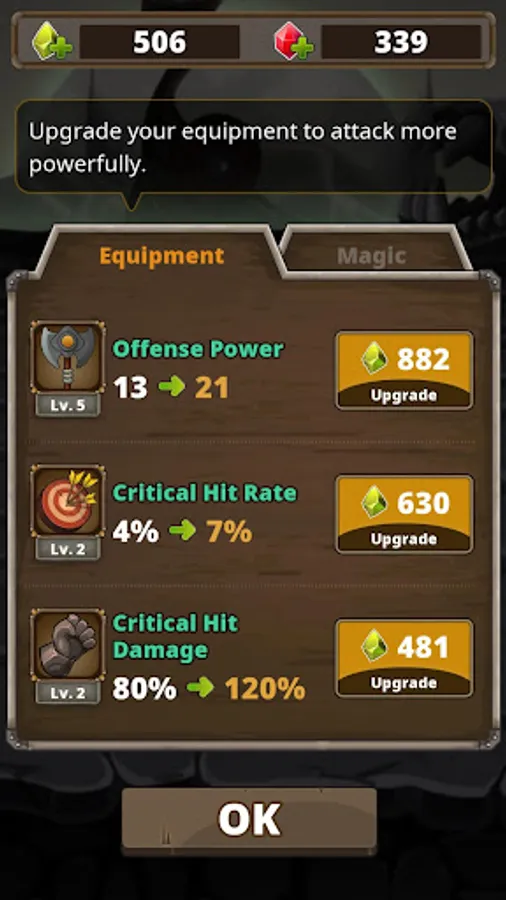 At Upgrade> Equipment, you can upgrade your offensive power.