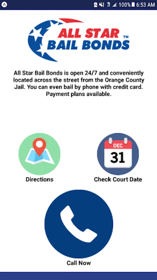 All Star Bail Bonds quick connect lets you quickly find us or call us with 1 click from our convenient app.