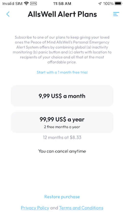 Subscribe for a month or a year to receive the benefits of the AllsWell Personal Safety & Emergency Alert application.