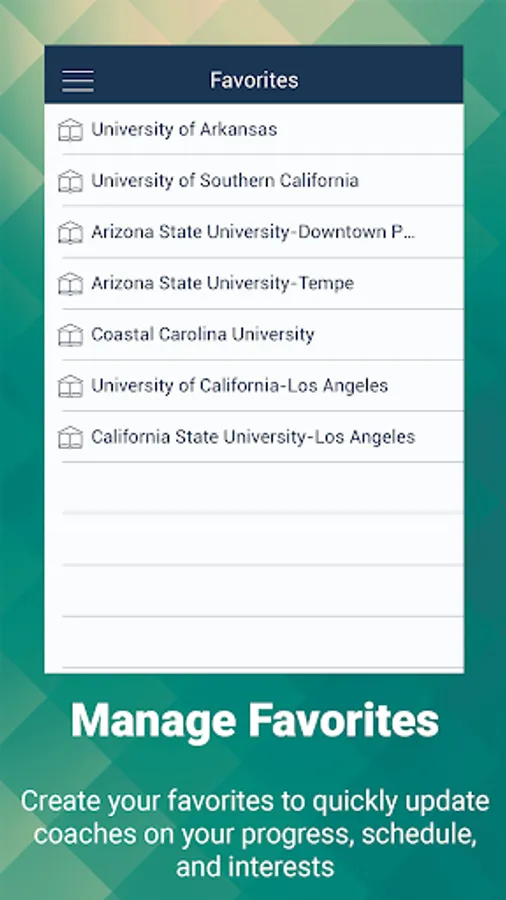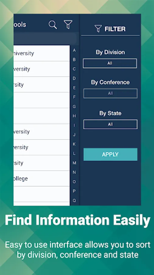 * Easy to use interface to sort and views schools by state, division, conference, or name.